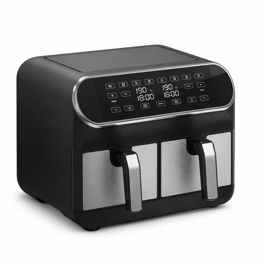 استمتع بتحضير وجباتك المفضلة بطريقة صحية وأسهل من أي وقت مضى مع المقلاة الهوائية بريميوم بسعة كبيرة 10 لتر. تصميم عصري فاخر مع هيكل ستانلس ستيل مقاوم للصدأ، وشاشة لمس LED ذكية تمنحك تحكمًا كاملاً بدرجة الحرارة والوقت بدقة عالية.
